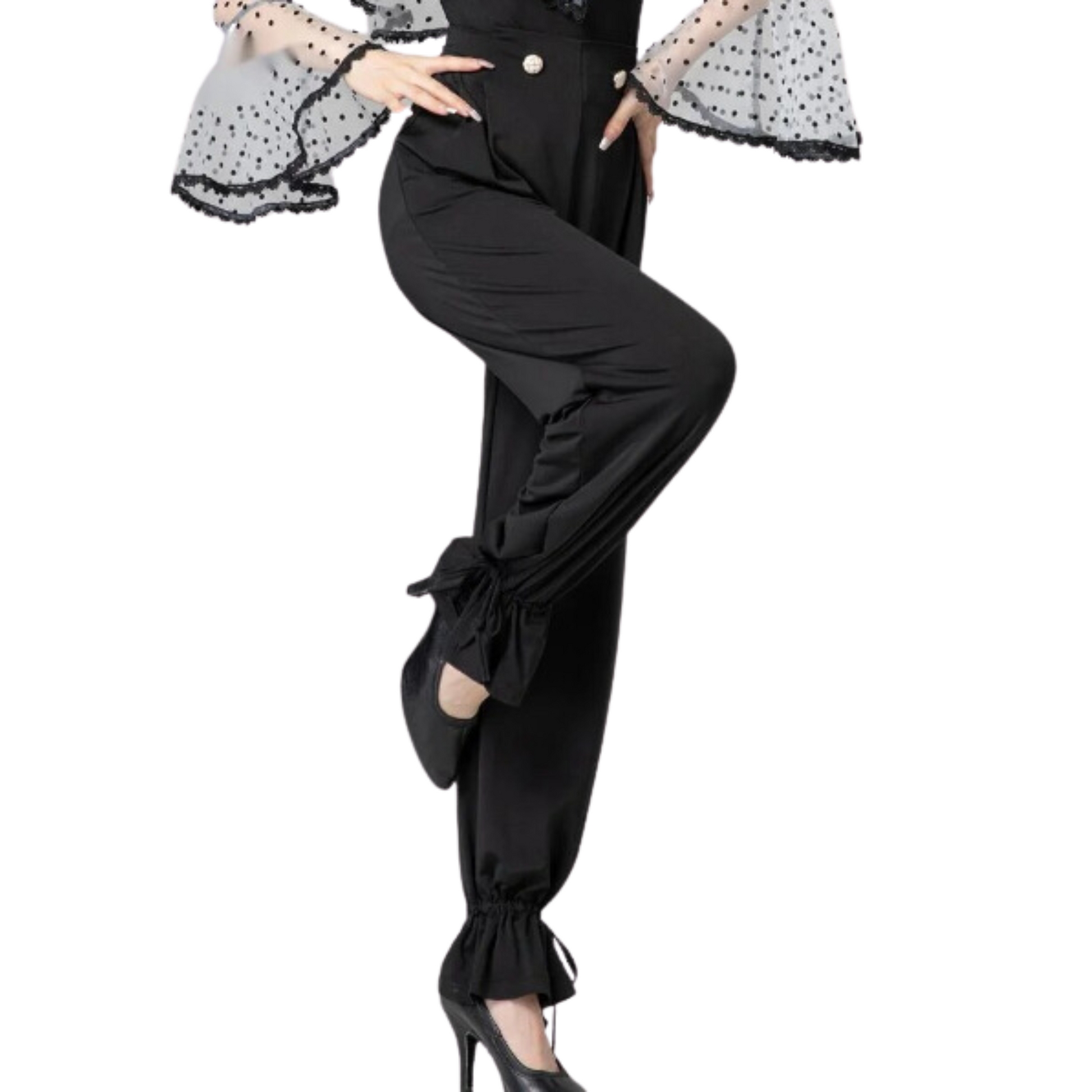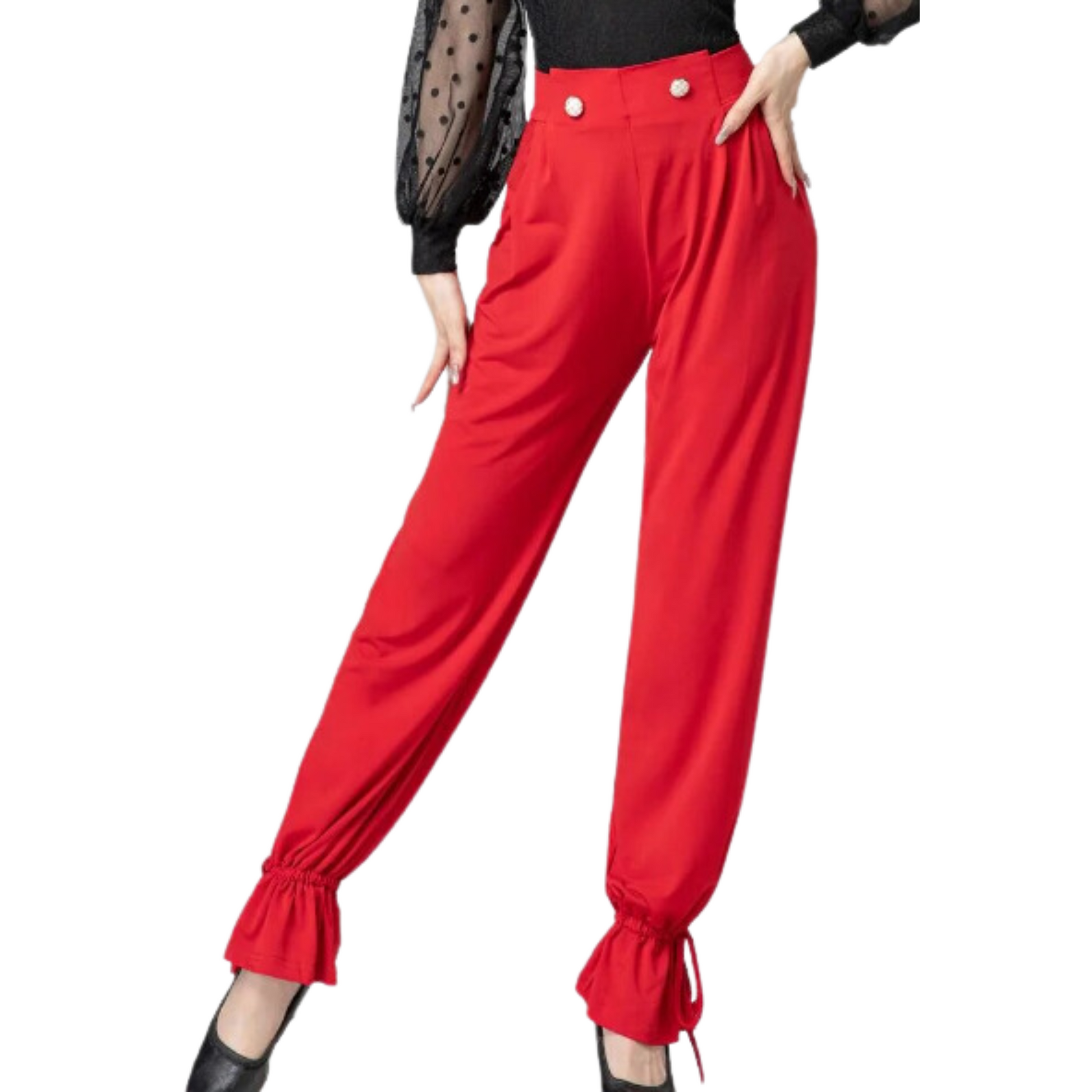 Capture the essence of ballroom elegance with our Eleganza 915 Ladies' Ballroom Dance Pants. These pants are a dance floor essential, designed to offer both flair and functionality. Available in classic black and radiant red, they feature a high waist and a relaxed fit that gracefully flows with your every move. The unique bow tie embellishments at the ankles add a dash of charm, elevating the traditional dance pant to a statement piece.