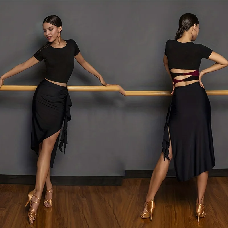 Ajoutez une touche d'élégance à votre pratique de danse avec notre jupe d'entraînement asymétrique pour le tango. Soigneusement conçue pour la danseuse moderne, cette jupe présente une coupe taille haute et un ourlet asymétrique qui s'écoule gracieusement à chaque pas et à chaque virage. La ceinture confortable mais sécurisée garantit que la jupe reste en place, que vous pratiquiez vos mouvements ou que vous vous produisiez.