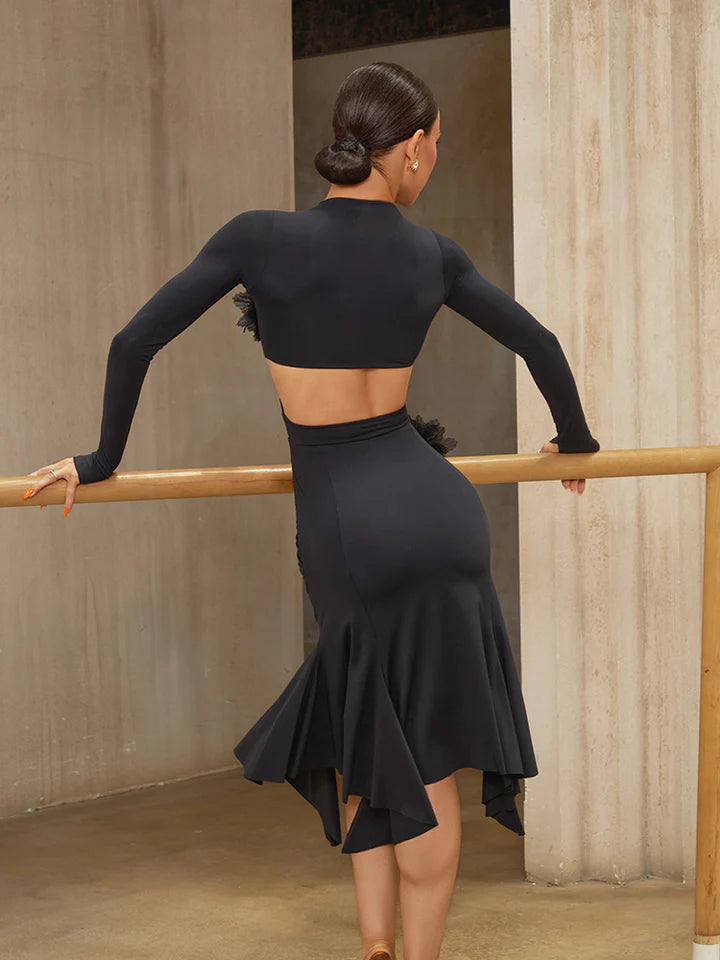 Ideal for Latin performances, showcases, and elegant practice sessions. The asymmetrical hemline highlights leg lines during spins and hip actions, while the floral accents add a refined visual detail. Pair with tan or black Latin heels depending on the desired stage contrast.