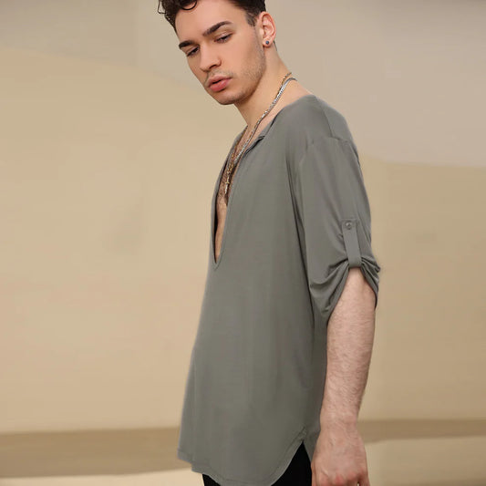 Men’s V-Neck Black Latin Dance Body Shirt | 813