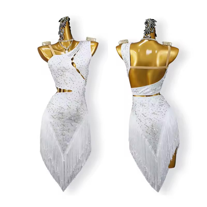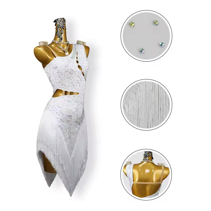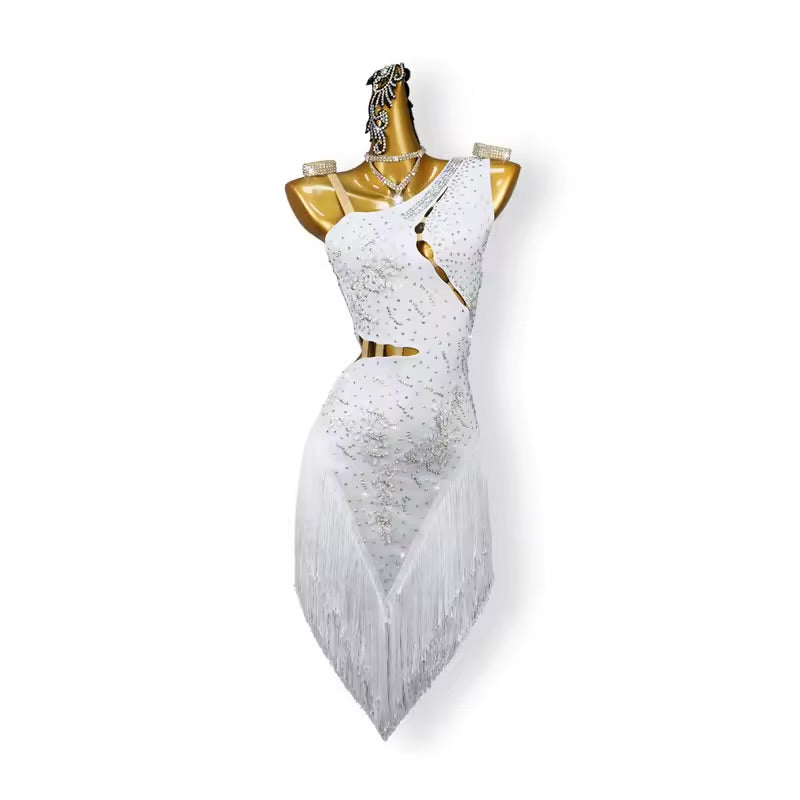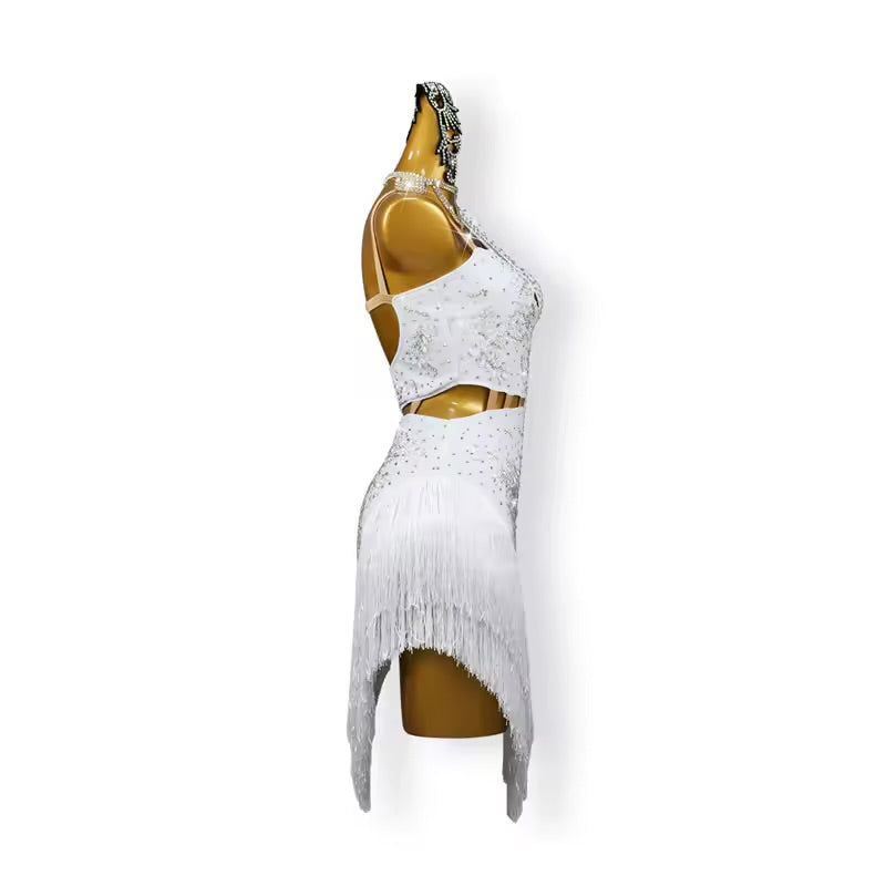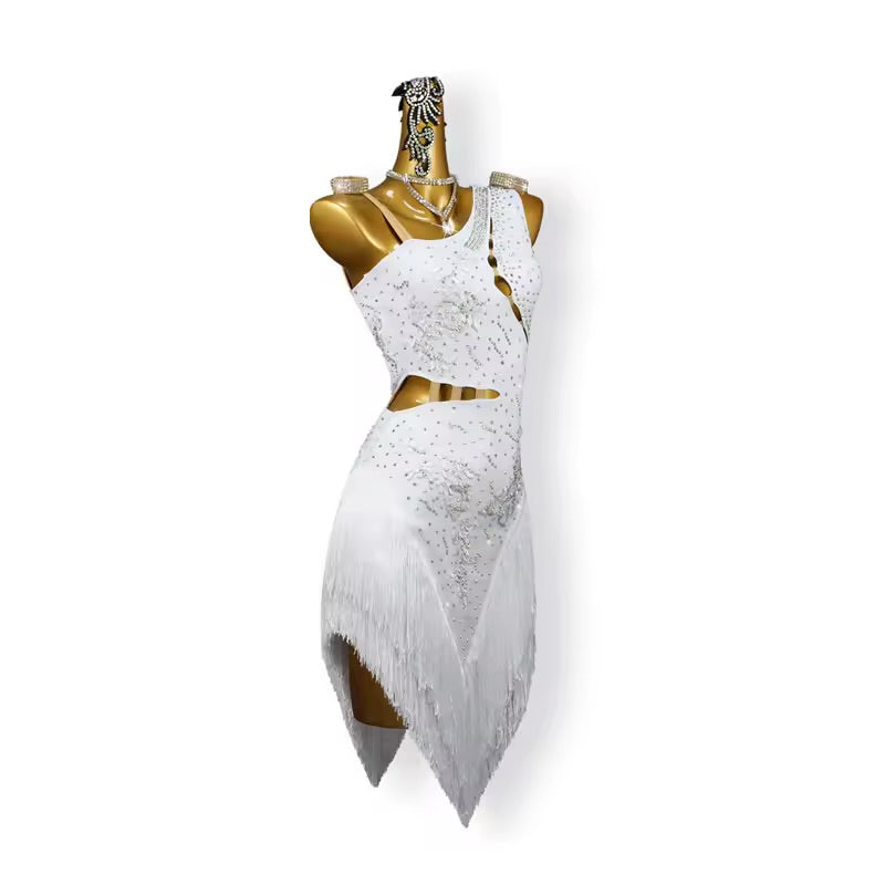 The dress is complete with a dramatic fringe hem that sways and flows with every step, perfectly capturing the essence of Latin dance. The asymmetrical neckline further complements the dynamic and stylish silhouette, ensuring you look as stunning as you feel.