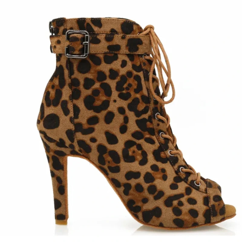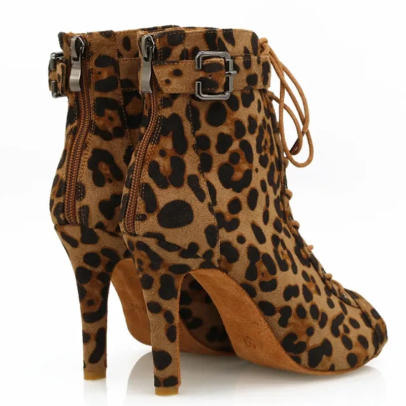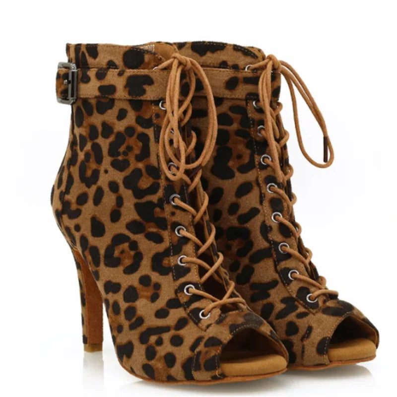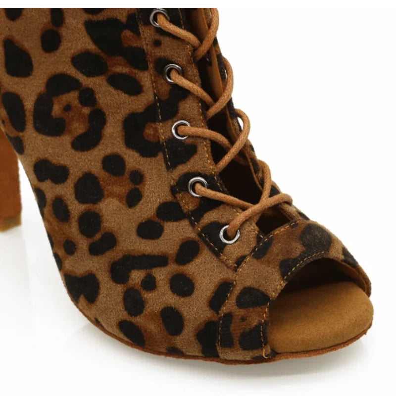Introducing 'Supine', a bold expression of dance and fashion combined. These Leopard Print Lace-Up Dance Booties are designed to make a statement while providing the comfort and support you need to perform. With a heel height perfect for Latin dance styles, these booties feature an adjustable lace-up design for a secure fit and an eye-catching leopard print for an added flair to your dance attire.