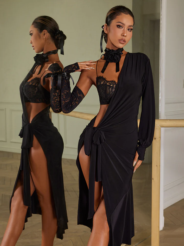 Crafted from Crystal Cotton, the fabric's stretchability ensures a fit that moves with you, highlighting your every step and turn. Lace sleeves add a touch of romance, framing your arms with exquisite detailing as you express yourself through dance. This attire is not just about looks; it's about providing you with control and confidence to own the dance floor.